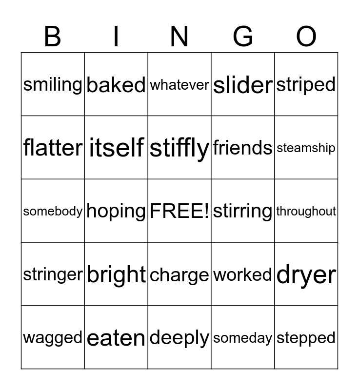 This bingo card has a free space and 24 words: bright, eaten, stiffly, wagged, striped, smiling, flatter, baked, stirring, charge, friends, somebody, worked, dryer, itself, someday, throughout, whatever, steamship, hoping, stepped, stringer, slider and deeply.