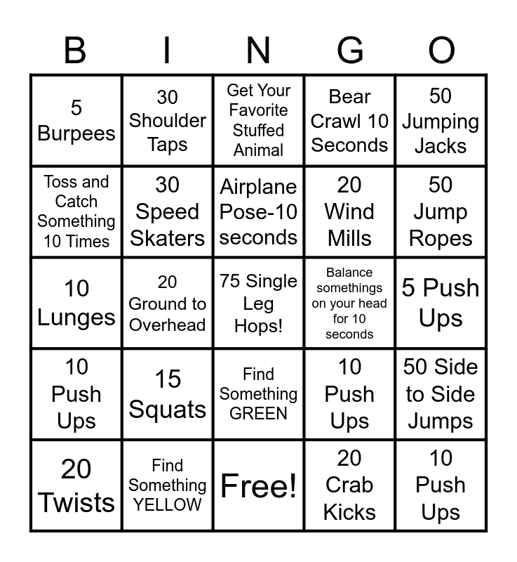 This bingo card has 25 words: 10 Push Ups, Find Something YELLOW, 75 Single Leg Hops!, 20 Crab Kicks, 50 Jumping Jacks, 5 Burpees, 30 Shoulder Taps, Get Your Favorite Stuffed Animal, Balance somethings on your head for 10 seconds, 50 Side to Side Jumps, Toss and Catch Something 10 Times, 30 Speed Skaters, Free!, 10 Push Ups, 50 Jump Ropes, 20 Twists, 20 Ground to Overhead, Airplane Pose-10 seconds, 20 Wind Mills, 5 Push Ups, 10 Lunges, 15 Squats, Find Something GREEN, Bear Crawl 10 Seconds and 10 Push Ups.