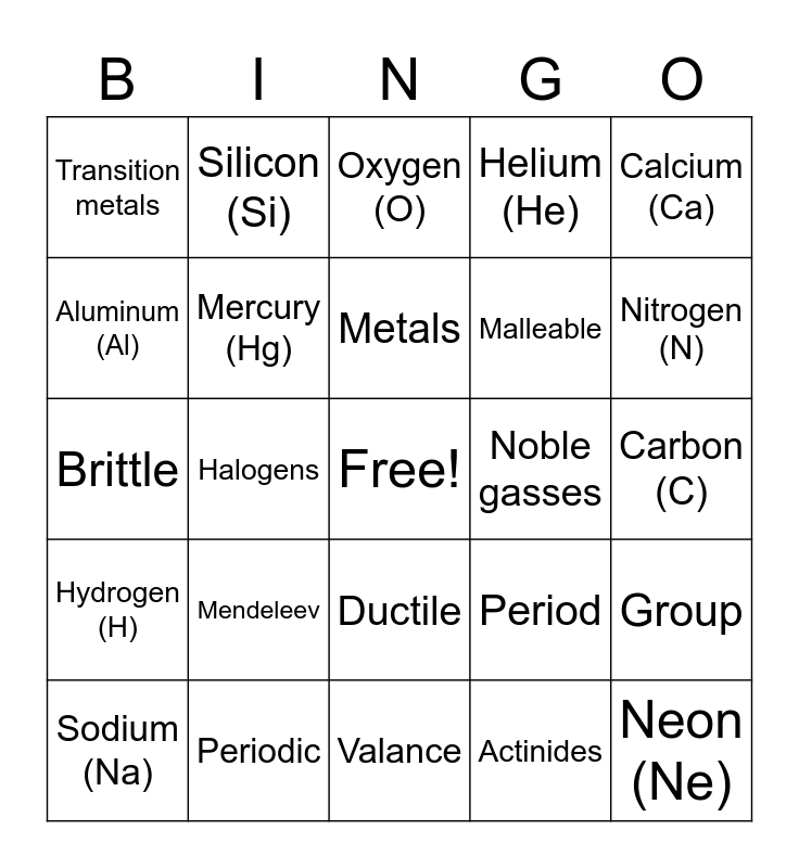 This bingo card has a free space and 24 words: Mendeleev, Periodic, Metals, Sodium (Na), Calcium (Ca), Transition metals, Aluminum (Al), Silicon (Si), Noble gasses, Ductile, Malleable, Brittle, Period, Group, Mercury (Hg), Actinides, Carbon (C), Oxygen (O), Nitrogen (N), Halogens, Neon (Ne), Hydrogen (H), Helium (He) and Valance.
