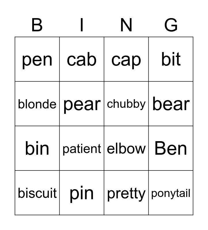 This bingo card has 16 words: pin, Ben, cap, pen, bin, cab, elbow, pretty, blonde, pear, biscuit, bit, patient, bear, chubby and ponytail.