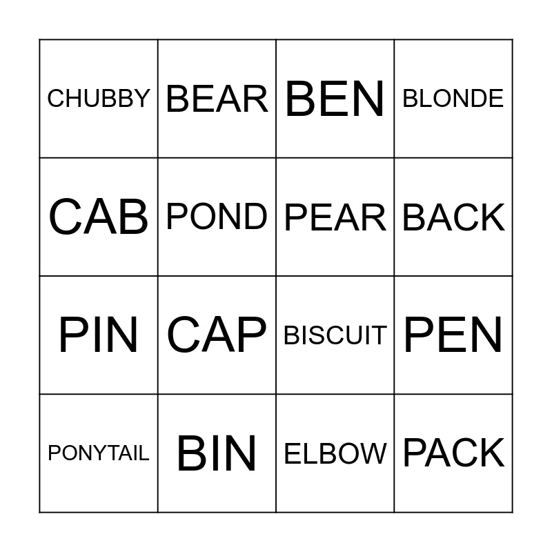 This bingo card has 16 words: BIN, PEN, BEN, CHUBBY, PIN, BEAR, BISCUIT, ELBOW, CAB, POND, PONYTAIL, BLONDE, CAP, BACK, PEAR and PACK.