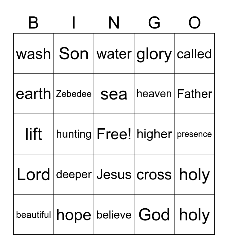This bingo card has a free space and 29 words: beautiful, garbage, hunting, price, wash, water, Zebedee, deeper, higher, hope, presence, holy, believe, God, Father, walk, Jesus, Lord, called, lift, cross, almighty, heaven, earth, glory, Son, holy, sea and Galilee.