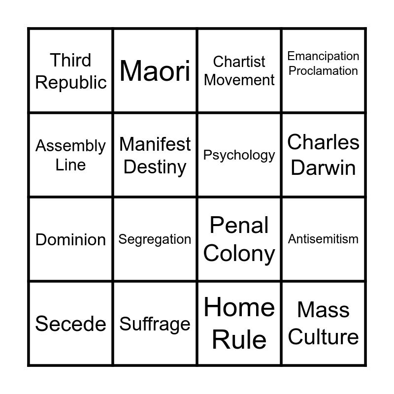 This bingo card has 16 words: Suffrage, Antisemitism, Chartist Movement, Third Republic, Dominion, Maori, Penal Colony, Home Rule, Assembly Line, Manifest Destiny, Secede, Emancipation Proclamation, Segregation, Charles Darwin, Psychology and Mass Culture.