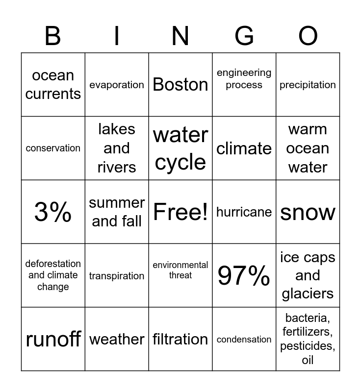 This bingo card has a free space and 24 words: transpiration, weather, water cycle, runoff, precipitation, ocean currents, conservation, evaporation, hurricane, environmental threat, climate, 3%, 97%, ice caps and glaciers, lakes and rivers, condensation, snow, Boston, warm ocean water, summer and fall, bacteria, fertilizers, pesticides, oil, deforestation and climate change, engineering process and filtration.