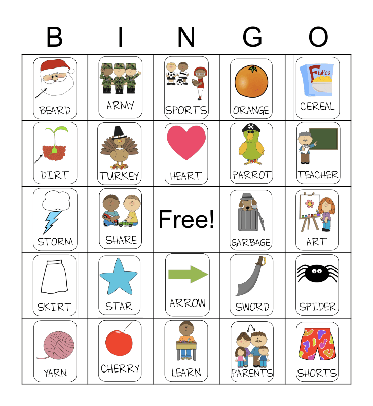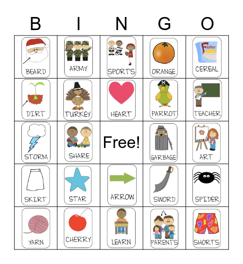 This bingo card has 24 images and a free space.