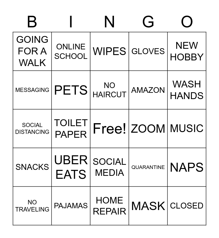 This bingo card has a free space and 24 words: UBER EATS, PAJAMAS, NO HAIRCUT, NO TRAVELING, NEW HOBBY, GOING FOR A WALK, MESSAGING, ONLINE SCHOOL, ZOOM, SOCIAL MEDIA, AMAZON, SOCIAL DISTANCING, QUARANTINE, NAPS, PETS, MASK, MUSIC, WIPES, WASH HANDS, TOILET PAPER, CLOSED, SNACKS, GLOVES and HOME REPAIR.