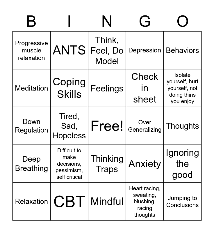 This bingo card has a free space and 24 words: Difficult to make decisions, pessimism, self critical, CBT, Feelings, Relaxation, Behaviors, Progressive muscle relaxation, Meditation, ANTS, Over Generalizing, Thinking Traps, Check in sheet, Down Regulation, Anxiety, Ignoring the good, Coping Skills, Heart racing, sweating, blushing, racing thoughts, Thoughts, Think, Feel, Do Model, Isolate yourself, hurt yourself, not doing thins you enjoy, Tired, Sad, Hopeless, Jumping to Conclusions, Deep Breathing, Depression and Mindful.