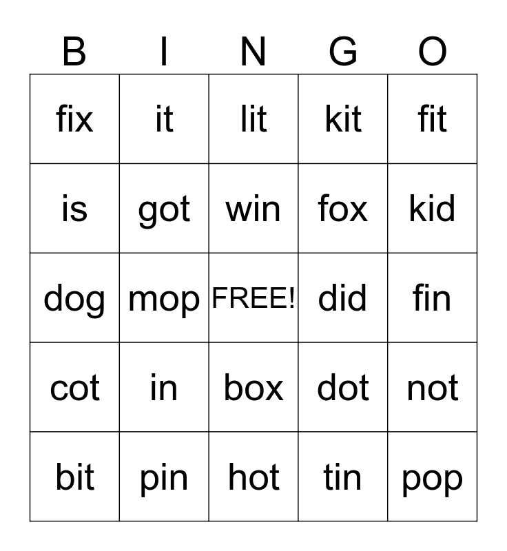 This bingo card has a free space and 24 words: in, pin, win, bit, fit, fix, is, it, did, box, fox, dog, dot, not, got, tin, fin, lit, kid, mop, pop, cot, kit and hot.