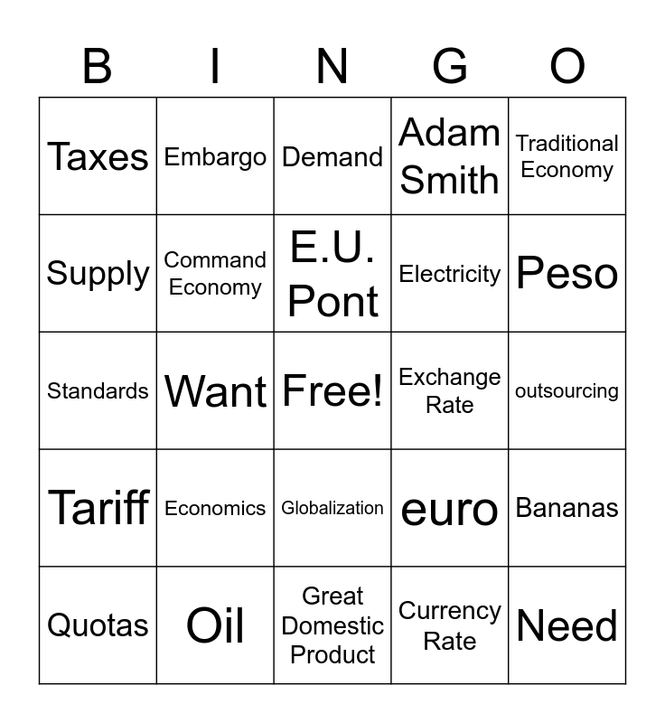 This bingo card has a free space and 24 words: Economics, Oil, E.U. Pont, Quotas, Traditional Economy, Taxes, Supply, Embargo, Exchange Rate, Globalization, Electricity, Standards, euro, Bananas, Command Economy, Currency Rate, outsourcing, Demand, Peso, Want, Need, Tariff, Adam Smith and Great Domestic Product.