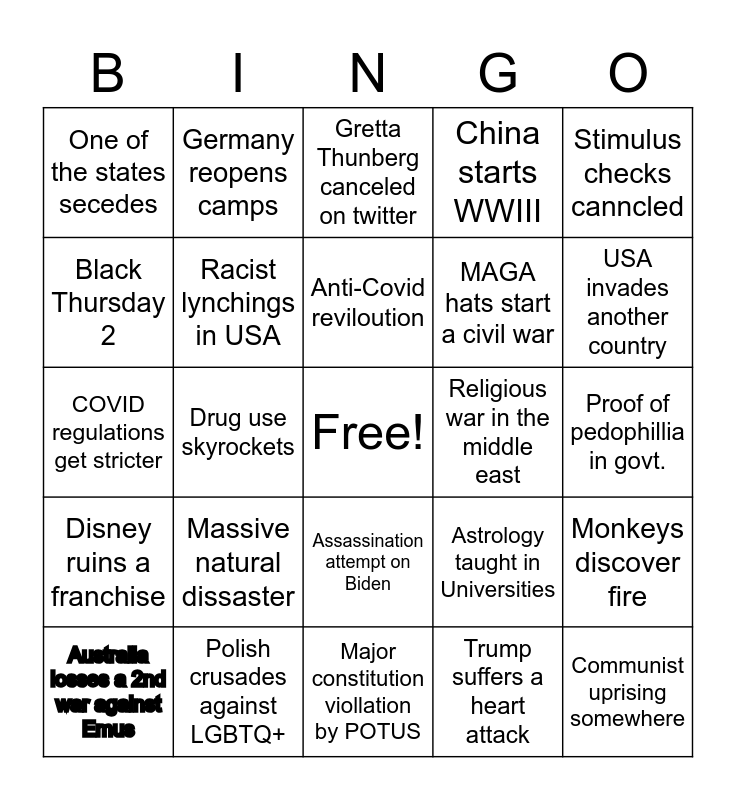 This bingo card has a free space and 24 words: Massive natural dissaster, Polish crusades against LGBTQ+, Anti-Covid reviloution, Australia losses a 2nd war against Emus, Stimulus checks canncled, One of the states secedes, Black Thursday 2, Germany reopens camps, Religious war in the middle east, Assassination attempt on Biden, MAGA hats start a civil war, COVID regulations get stricter, Astrology taught in Universities, Monkeys discover fire, Racist lynchings in USA, Trump suffers a heart attack, Proof of pedophillia in govt., Gretta Thunberg canceled on twitter, USA invades another country, Drug use skyrockets, Communist uprising somewhere, Disney ruins a franchise, China starts WWIII and Major constitution viollation by POTUS.