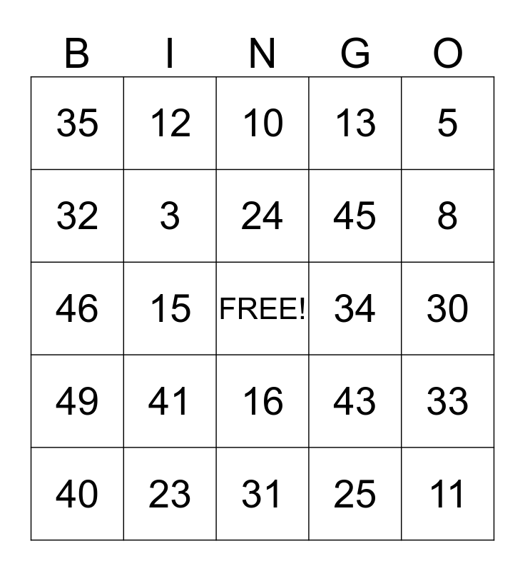 This bingo card has a free space and 50 words: 1, 11, 21, 31, 41, 2, 12, 22, 32, 42, 3, 13, 33, 43, 4, 14, 24, 34, 44, 5, 15, 25, 35, 45, 6, 7, 8, 9, 10, 16, 17, 18, 19, 20, 23, 26, 27, 28, 29, 30, 36, 37, 38, 39, 40, 46, 47, 48, 49 and 50.