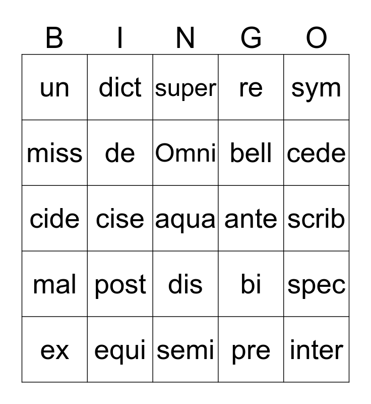 This bingo card has 30 words: equi, audi, cise, circum, un, super, de, dis, ante, semi, scrib, aqua, pre, inter, cede, sub, bi, mal, post, sym, cide, cred, dict, bell, miss, re, spec, ex, Omni and pend.