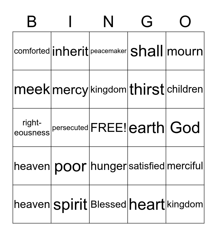 This bingo card has a free space and 24 words: poor, spirit, kingdom, heaven, mourn, comforted, meek, inherit, earth, hunger, thirst, right- eousness, satisfied, merciful, mercy, heart, God, peacemaker, children, persecuted, kingdom, heaven, shall and Blessed.