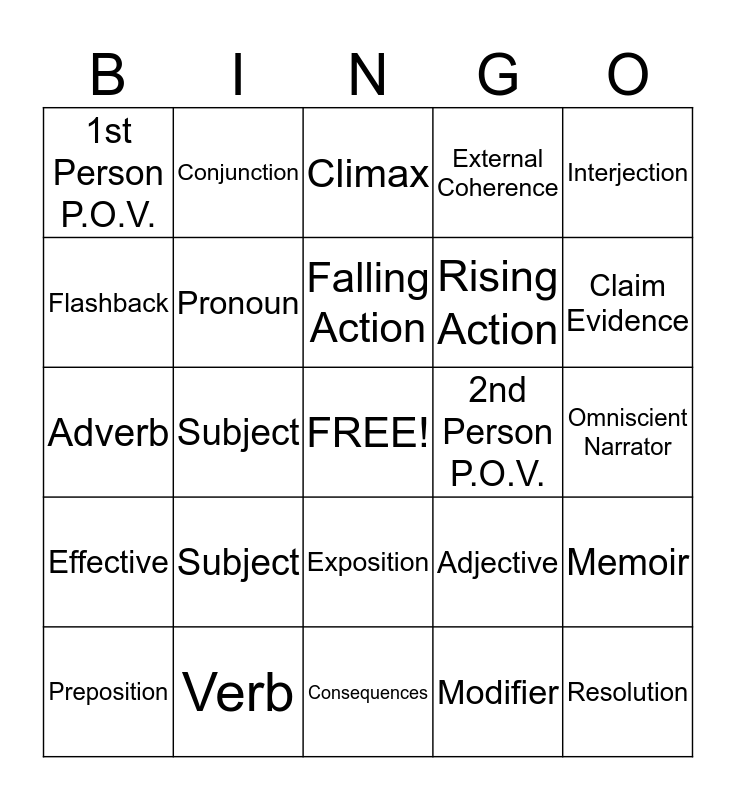 This bingo card has a free space and 24 words: Subject, Verb, Falling Action, Preposition, Interjection, 1st Person P.O.V., Flashback, Conjunction, 2nd Person P.O.V., Exposition, Rising Action, Adverb, Adjective, Memoir, Pronoun, Modifier, Omniscient Narrator, Climax, Claim Evidence, Subject, Resolution, Effective, External Coherence and Consequences.