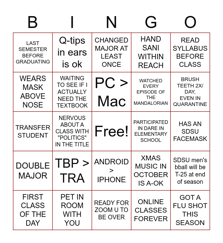 This bingo card has a free space and 29 words: FIRST CLASS OF THE DAY, STILL WEARING PAJAMAS, NERVOUS ABOUT A CLASS WITH "POLITICS" IN THE TITLE, READ AN ARTICLE ABOUT COVID-19 TODAY, LAST SEMESTER BEFORE GRADUATING, CHANGED MAJOR AT LEAST ONCE, WAITING TO SEE IF I ACTUALLY NEED THE TEXTBOOK, TBP > TRA, PARTICIPATED IN DARE IN ELEMENTARY SCHOOL, PET IN ROOM WITH YOU, HAS AN SDSU FACEMASK, GOT A FLU SHOT THIS SEASON, READY FOR ZOOM U TO BE OVER, ONLINE CLASSES FOREVER, BRUSH TEETH 2X/ DAY, EVEN IN QUARANTINE, Mac > PC, ANDROID > IPHONE, DOUBLE MAJOR, READ SYLLABUS BEFORE CLASS, TRANSFER STUDENT, XMAS MUSIC IN OCTOBER IS A-OK, DONE A TIKTOK DANCE, WATCHED EVERY EPISODE OF THE MANDALORIAN, WEARS MASK ABOVE NOSE, HAND SANI WITHIN REACH, Q-tips in ears is ok, SDSU men's bball will be T-25 at end of season, PC > Mac and iPhone > Android.