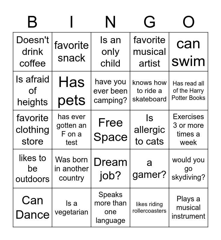 This bingo card has a free space and 29 words: Can Dance, Has never traveled outside the US, has ever gotten an F on a test, Likes horror movies, Doesn't drink coffee, Is an only child, Has pets, Was born in another country, Is allergic to cats, Is a vegetarian, Exercises 3 or more times a week, Plays a musical instrument, Speaks more than one language, likes riding rollercoasters, Has read all of the Harry Potter Books, Does not drink soda, Dream job?, likes to be outdoors, can swim, favorite clothing store, a gamer?, Favorite fast food place?, knows how to ride a skateboard, Is afraid of heights, favorite musical artist, favorite snack, would you go skydiving?, have you ever been camping? and traveled internationally?.