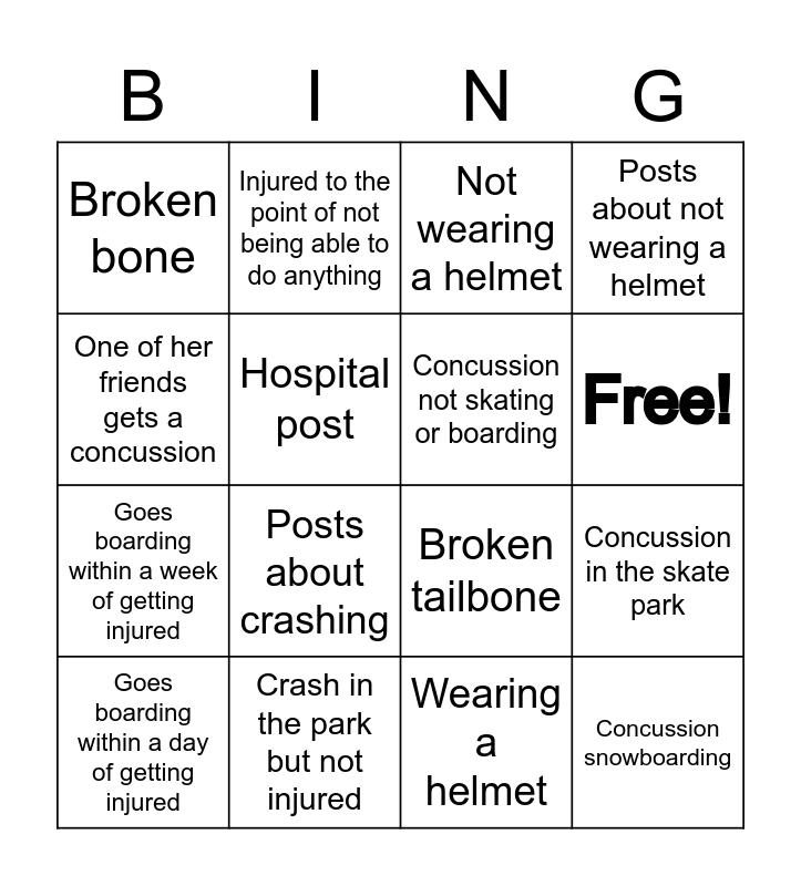 This bingo card has 16 words: Crash in the park but not injured, Concussion in the skate park, Not wearing a helmet, Broken bone, Goes boarding within a week of getting injured, Injured to the point of not being able to do anything, Broken tailbone, Wearing a helmet, One of her friends gets a concussion, Hospital post, Goes boarding within a day of getting injured, Posts about not wearing a helmet, Posts about crashing, Free!, Concussion not skating or boarding and Concussion snowboarding.