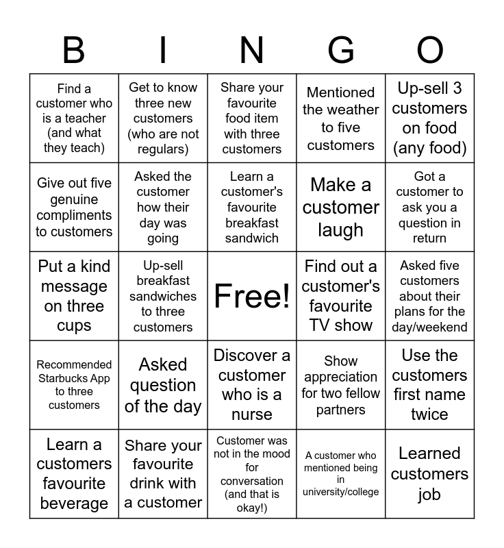 This bingo card has a free space and 24 words: Asked question of the day, Share your favourite drink with a customer, Learn a customer's favourite breakfast sandwich, Learn a customers favourite beverage, Up-sell 3 customers on food (any food), Find a customer who is a teacher (and what they teach), Give out five genuine compliments to customers, Get to know three new customers (who are not regulars), Find out a customer's favourite TV show, Discover a customer who is a nurse, Make a customer laugh, Put a kind message on three cups, Show appreciation for two fellow partners, Use the customers first name twice, Asked the customer how their day was going, A customer who mentioned being in university/college, Asked five customers about their plans for the day/weekend, Share your favourite food item with three customers, Got a customer to ask you a question in return, Up-sell breakfast sandwiches to three customers, Learned customers job, Recommended Starbucks App to three customers, Mentioned the weather to five customers and Customer was not in the mood for conversation (and that is okay!).