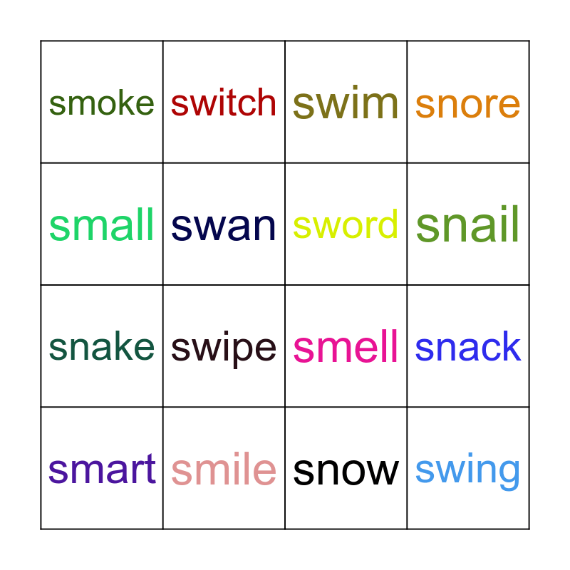 This bingo card has 16 words: smile, snack, swim, smoke, snake, switch, smell, snow, small, swan, smart, snore, swipe, snail, sword and swing.