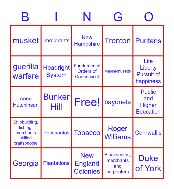 This bingo card has a free space and 94 words: Middle Colonies, Southern Colonies, New England Colonies, Jamestown, Virginia, North Carolina, South Carolina, Georgia, Maryland, Delaware, New Jersey, New York, Rhode Island, Massachusetts, Pilgrims, Puritans, New Hampshire, Connecticut, Pennsylvania, John Winthrop, George Calvert, John Smith, John Rolfe, Powhatan Confederacy, Pocahontas, Headright System, Indentured System, Slaves, Bacons Rebellion, Toleration Act of 1649, Plantations, Tobacco, Cash Crops, Slave Codes, Immigrants, Mayflower Compact, Squanto, Thomas Hooker, Fundamental Orders of Connecticut, Roger Williams, Anne Hutchinson, Shipbuilding, fishing, merchants skilled craftspeople, Public and Higher Education, Peter Stuyvesant, Duke of York, Berkeley and Carteret, William Penn, Quakers, Staple Crops, wheat, barley and oats, Cities, Blacksmiths, merchants and carpenters, Dutch, Swedes, Revolutionary War, Declaration of Rights, Olive Branch Petition, George Washington, Lexington and Concord, Fort Ticonderoga, Bunker Hill, Dorchester Heights, First Continental Congress, Second Continental Congress, Boston, Breeds Hill, Charleston, Treaty of Paris 1783, guerilla warfare, Yorktown, Saratoga, Swampfox, von Steuben, Lafayette, Trenton, Alexander Hamilton, Thomas Paine, Life Liberty Pursuit of happiness, Cornwallis, Hessians, mercenaries, small pox, Valley Forge, bayonets, musket, Green Mountain Boys, Henry Knox, John Paul Jones, Molly Pitcher, France, Spain, Benedict Arnold, Spies and Surrender.