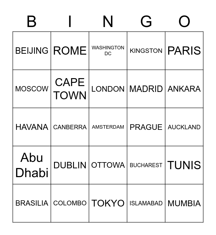 This bingo card has 25 words: DUBLIN, TOKYO, LONDON, BRASILIA, PARIS, BEIJING, MOSCOW, ROME, PRAGUE, OTTOWA, MADRID, HAVANA, BUCHAREST, TUNIS, CAPE TOWN, MUMBIA, AUCKLAND, WASHINGTON DC, ANKARA, CANBERRA, AMSTERDAM, COLOMBO, Abu Dhabi, KINGSTON and ISLAMABAD.