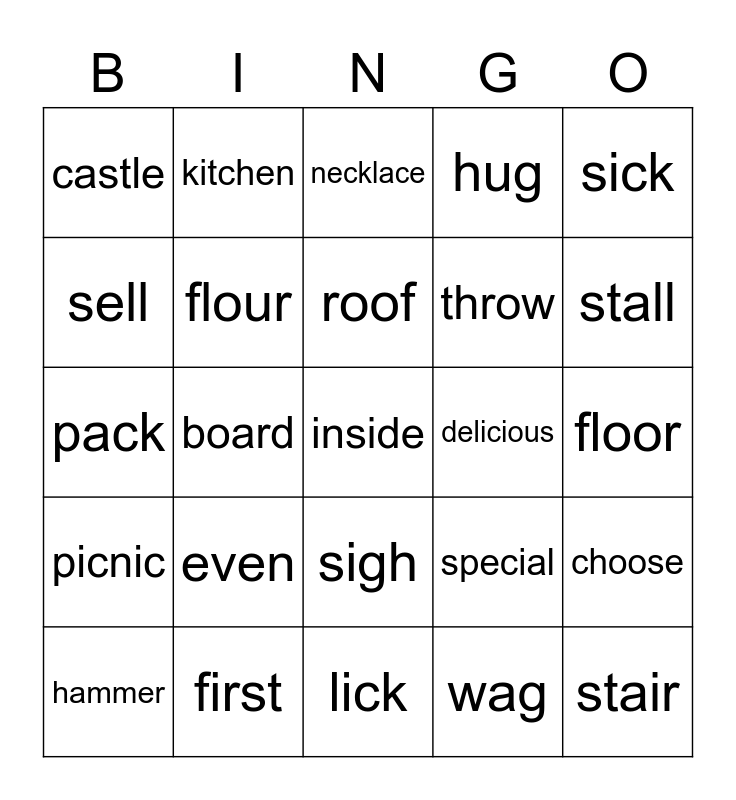 This bingo card has a free space and 29 words: hammer, saw, board, dream, castle, necklace, flour, even, delicious, first, floor, stair, lick, wag, stall, laugh, sigh, picnic, sick, pack, special, surprised, throw, sell, hug, kitchen, choose, roof and break.