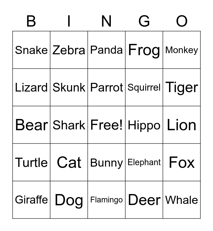 This bingo card has a free space and 24 words: Cat, Dog, Parrot, Giraffe, Monkey, Snake, Lizard, Zebra, Hippo, Bunny, Squirrel, Bear, Elephant, Fox, Skunk, Deer, Lion, Panda, Tiger, Shark, Whale, Turtle, Frog and Flamingo.