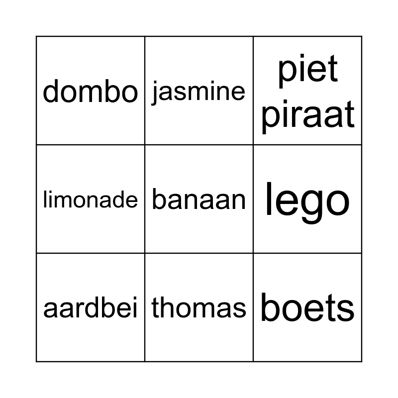 This bingo card has a free space and 8 words: lego, piet piraat, jasmine, aardbei, dombo, boets, limonade and thomas.