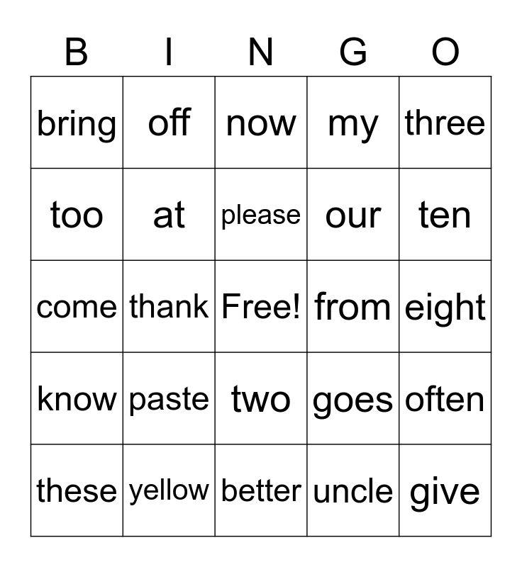 This bingo card has a free space and 24 words: paste, yellow, please, these, three, bring, too, off, from, two, our, come, goes, often, at, uncle, eight, now, ten, thank, give, know, my and better.