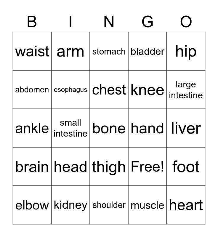 This bingo card has 25 words: head, shoulder, chest, elbow, hip, waist, abdomen, arm, hand, thigh, knee, ankle, Free!, foot, esophagus, heart, liver, stomach, large intestine, small intestine, bone, kidney, brain, bladder and muscle.