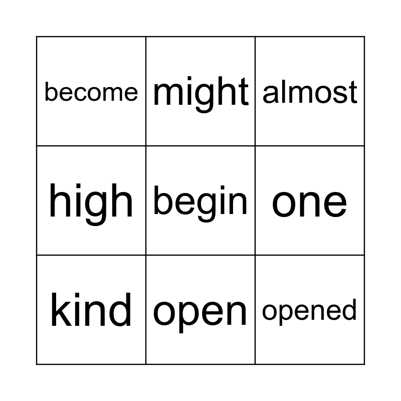 This bingo card has 10 words: open, almost, become, begin, high, kind, might, night, one and opened.
