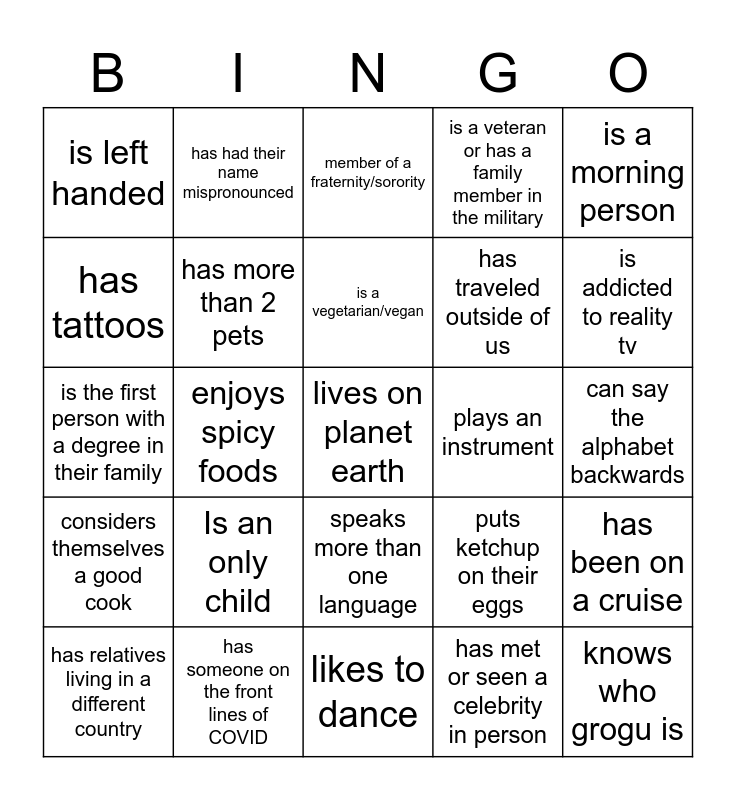 This bingo card has a free space and 24 words: Is an only child, has someone on the front lines of COVID, is a vegetarian/vegan, has relatives living in a different country, is a morning person, is left handed, has tattoos, has had their name mispronounced, plays an instrument, speaks more than one language, has traveled outside of us, is the first person with a degree in their family, puts ketchup on their eggs, has been on a cruise, has more than 2 pets, has met or seen a celebrity in person, can say the alphabet backwards, member of a fraternity/sorority, is addicted to reality tv, enjoys spicy foods, knows who grogu is, considers themselves a good cook, is a veteran or has a family member in the military and likes to dance.