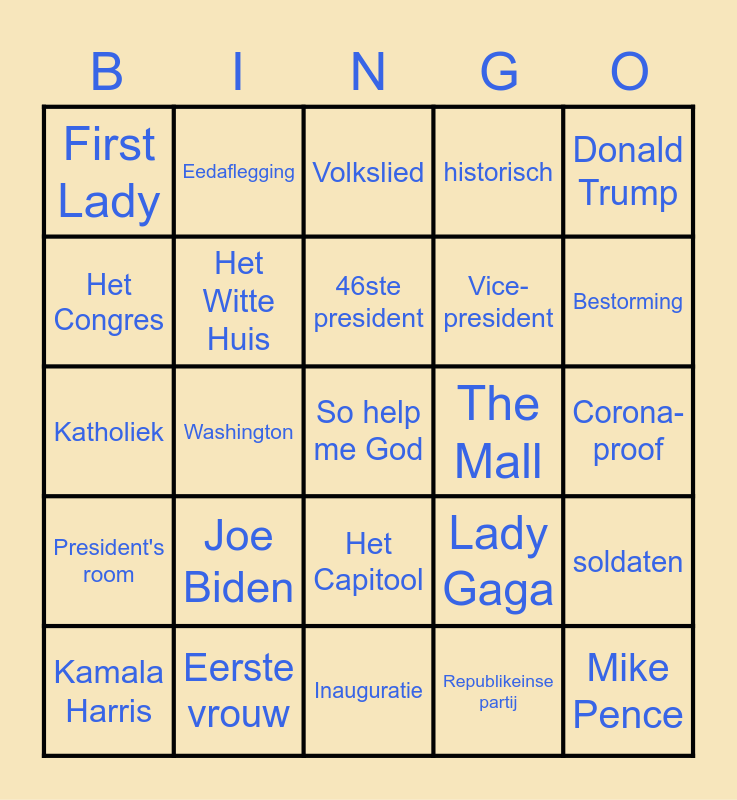 This bingo card has 25 words: Joe Biden, Inauguratie, 46ste president, Kamala Harris, Donald Trump, First Lady, Het Congres, Eedaflegging, The Mall, Het Capitool, Vice-president, Katholiek, Lady Gaga, soldaten, Het Witte Huis, Mike Pence, Corona-proof, Volkslied, Bestorming, Washington, So help me God, Eerste vrouw, President's room, historisch and Republikeinse partij.