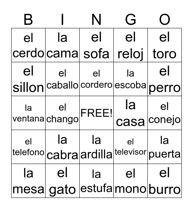 This bingo card has a free space and 27 words: el televisor, la lampara, la escoba, la estufa, el sillon, el sofa, la cama, el telefono, la casa, la puerta, la ventana, el reloj, la mesa, el gato, el perro, la vaca, el caballo, el cordero, la cabra, el cerdo, el conejo, el mono, el chango, el burro, la ardilla, el toro and el zorrillo.