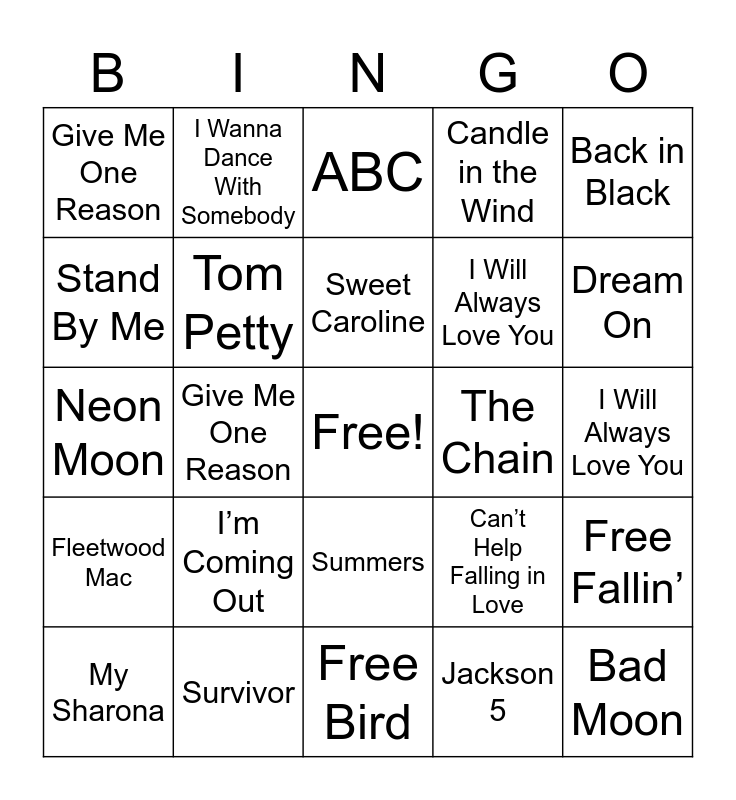 This bingo card has a free space and 58 words: AC/DC, Survivor, Neil Diamond, Fleetwood Mac, Jackson 5, The Knack, Tom Petty, John Mellancamp, I Will Always Love You, Billie Jean, Candle in the Wind, Dream On, Brown Eyed Girl, I Wanna Hold Your Hand, Don’t Stop Believing, Give Me One Reason, Bad Moon, Back in Black, Eye of the Tiger, Sweet Caroline, The Chain, ABC, My Sharona, Free Fallin’, Jack and Diane, I Will Always Love You, Billie Jean, Candle in the Wind, Dream On, Brown Eyed Girl, I Wanna Hold Your Hand, Happy, Uptown Funk, Play the Game, 9 to 5, Holy, Hit Me Baby One More Time, Give Me One Reason, Neon Moon, Bad Moon, I’m Coming Out, Sugar, Can’t Help Falling in Love, Hello, Circles, Baby Beluga, The Gambler, Summers, Free Bird, Always Be My Baby, Born in the U.S.A, Love On Top, Your Body Is A Wonderland, It’s Gonna Be Me, I Wanna Dance With Somebody, Take Me Home, Country Roads, Stand By Me and Don’t Stop Believing.