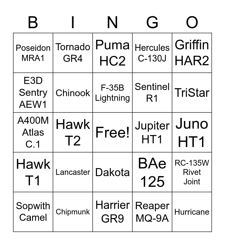 This bingo card has a free space and 40 words: A109SP, A400M Atlas C.1, BAe146, Chinook, Chipmunk, Dakota, F-35B Lightning, Globemaster C-17, Griffin HAR2, Hawk T1, Hawk T2, Hercules C-130J, Hurricane, Juno HT1, Jupiter HT1, Lancaster, Phenom T1, Poseidon MRA1, Prefect T1, Puma HC2, RC-135W Rivet Joint, Reaper MQ-9A, Sentinel R1, E3D Sentry AEW1, Shadow R1, Spitfire, Texan T1, Tutor T1, Typhoon FGR4, Viking T1, Voyager, Sopwith Camel, Gloster Meteor F8, BAe 125, TriStar, Harrier GR9, AW101 Merlin, Short Tucano, Tornado GR4 and Sea King.
