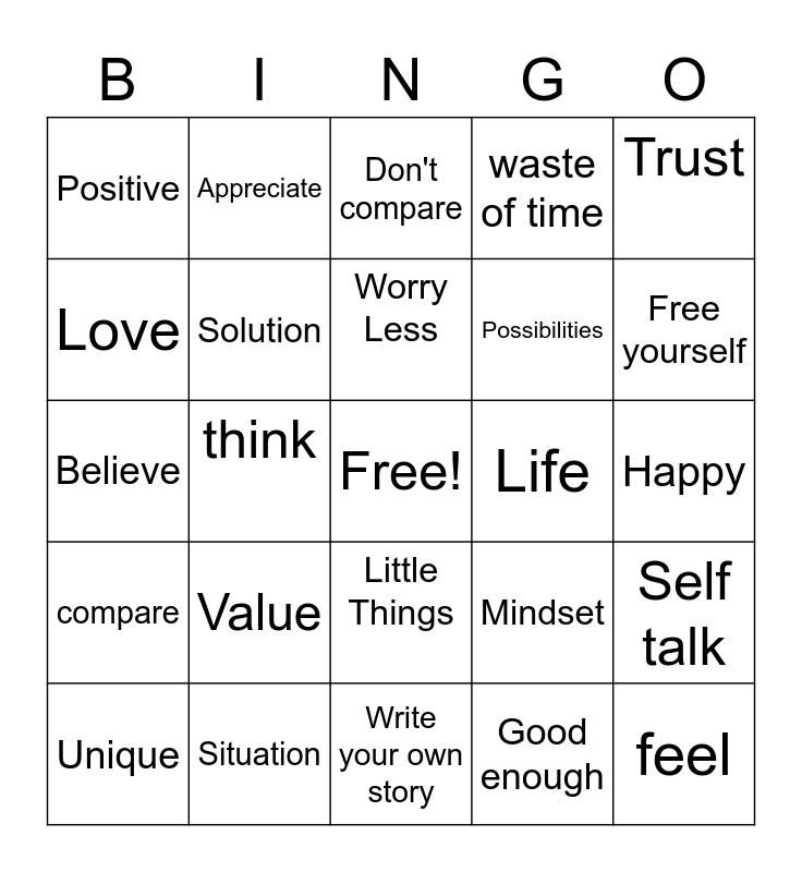 This bingo card has a free space and 24 words: Value, Situation, Worry Less, Unique, Trust, Positive, Love, Appreciate, Life, Little Things, Possibilities, Believe, Mindset, Self talk, Solution, Good enough, Happy, Don't compare, Free yourself, think, feel, compare, waste of time and Write your own story.