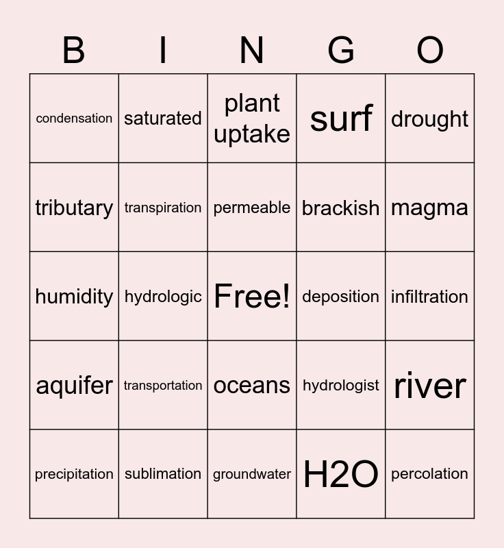 This bingo card has a free space and 29 words: precipitation, runoff, hydrologic, evaporation, condensation, plant uptake, transpiration, transportation, deposition, sublimation, infiltration, percolation, groundwater, H2O, magma, clouds, oceans, aquifer, drought, humidity, hydrologist, tides, brackish, tributary, surf, saturated, river, permeable and hail.