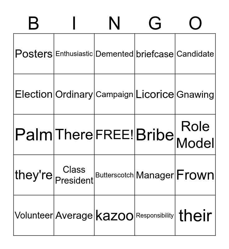 This bingo card has a free space and 24 words: Class President, Average, Campaign, Volunteer, Candidate, Posters, Election, Enthusiastic, Bribe, Butterscotch, Licorice, Palm, Manager, Frown, Ordinary, Responsibility, Role Model, Demented, Gnawing, There, their, they're, briefcase and kazoo.