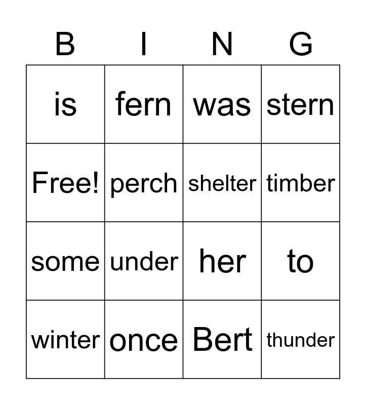 This bingo card has 16 words: once, to, was, is, some, fern, her, Bert, Free!, perch, winter, stern, under, timber, shelter and thunder.