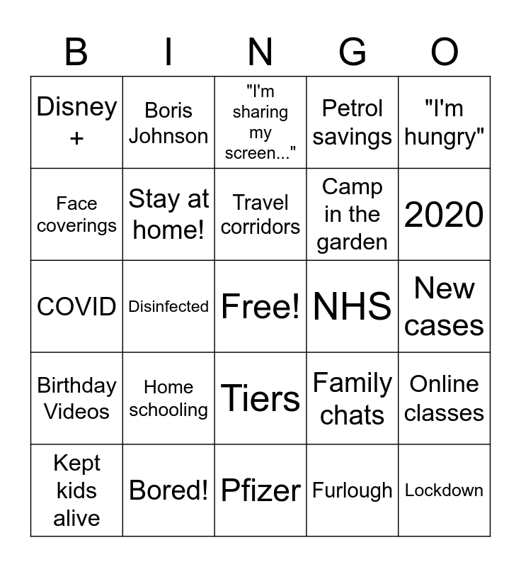 This bingo card has a free space and 44 words: Online shopping, Lockdown, Essential Shopping, Kept kids alive, Daily update, Furlough, "I'm sharing my screen...", Family Walks, "I'm hungry", Bored!, Petrol savings, NHS, Tiers, Home schooling, Virtual, Pfizer, Astrazeneca, COVID, Governement, 2020, Boris Johnson, Cried, Gloves, Disney +, Binge watch, New cases, Daily update, Baking, Family chats, Birthday Videos, Joe Wicks, Online classes, Toilet paper, Wash Your Hands!, Disinfected, Learnt something new, Guilt, Social distancing, Travel corridors, Face coverings, Camp in the garden, Quarantine, Stay at home! and Online shopping.