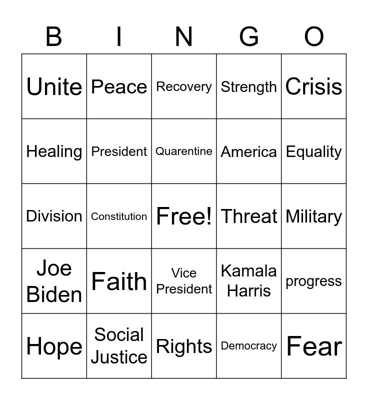 This bingo card has a free space and 24 words: Hope, Faith, Quarentine, Democracy, Crisis, Unite, Peace, Recovery, Threat, Military, Division, President, Kamala Harris, progress, Healing, Social Justice, Rights, Strength, Equality, Joe Biden, Constitution, Vice President, America and Fear.