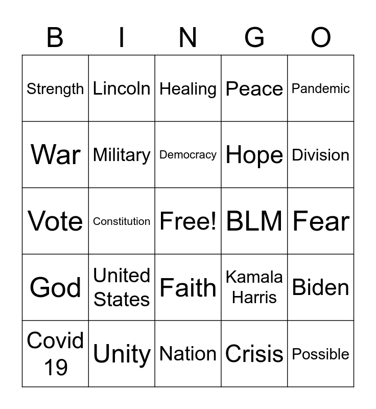 This bingo card has a free space and 24 words: United States, Unity, Democracy, Covid 19, Pandemic, Strength, War, Lincoln, BLM, Faith, Hope, Vote, Kamala Harris, Biden, Military, Crisis, Fear, Healing, Division, Constitution, Possible, God, Peace and Nation.