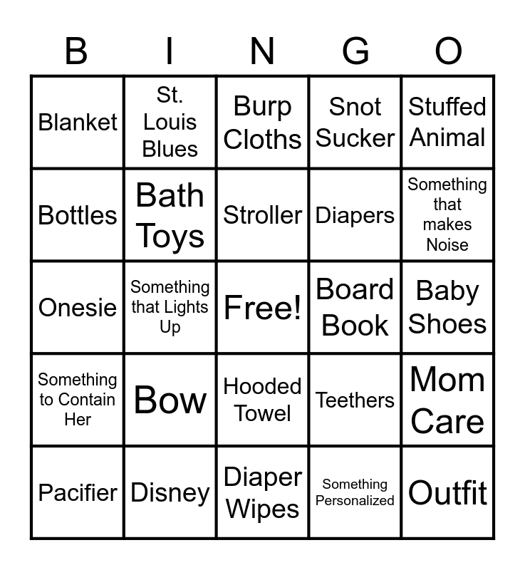 This bingo card has a free space and 24 words: Bow, Disney, Stroller, Pacifier, Stuffed Animal, Blanket, Bottles, St. Louis Blues, Board Book, Hooded Towel, Diapers, Onesie, Teethers, Mom Care, Bath Toys, Something Personalized, Baby Shoes, Burp Cloths, Something that makes Noise, Something that Lights Up, Outfit, Something to Contain Her, Snot Sucker and Diaper Wipes.