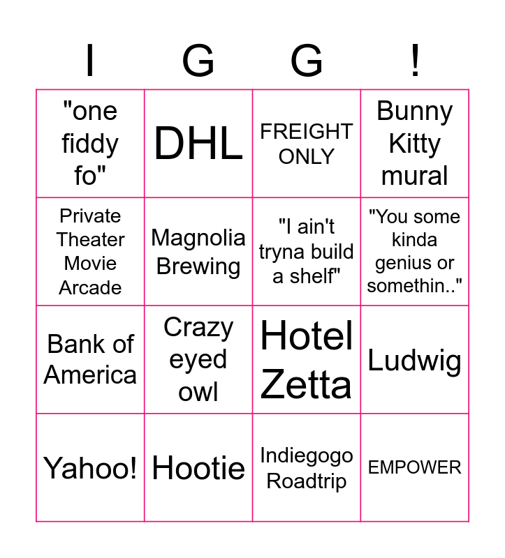 This bingo card has 16 words: Hootie, Ludwig, FREIGHT ONLY, "one fiddy fo", Bank of America, DHL, Hotel Zetta, Indiegogo Roadtrip, Private Theater Movie Arcade, Magnolia Brewing, Yahoo!, Bunny Kitty mural, Crazy eyed owl, "You some kinda genius or somethin..", "I ain't tryna build a shelf" and EMPOWER.
