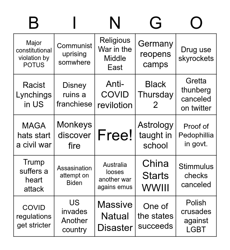 This bingo card has a free space and 24 words: Assasination attempt on Biden, US invades Another country, Anti-COVID revilotion, COVID regulations get stricter, Drug use skyrockets, Major constitutional violation by POTUS, Racist Lynchings in US, Communist uprising somwhere, Astrology taught in school, Australia looses another war agains emus, Black Thursday 2, MAGA hats start a civil war, China Starts WWIII, Stimmulus checks canceled, Disney ruins a franchiese, One of the states succeeds, Proof of Pedophillia in govt., Religious War in the Middle East, Gretta thunberg canceled on twitter, Monkeys discover fire, Polish crusades against LGBT, Trump suffers a heart attack, Germany reopens camps and Massive Natual Disaster.