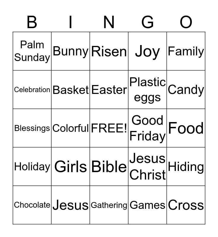 This bingo card has a free space and 24 words: Girls, Jesus, Easter, Chocolate, Family, Palm Sunday, Celebration, Bunny, Good Friday, Bible, Plastic eggs, Blessings, Jesus Christ, Hiding, Basket, Games, Food, Risen, Candy, Colorful, Cross, Holiday, Joy and Gathering.
