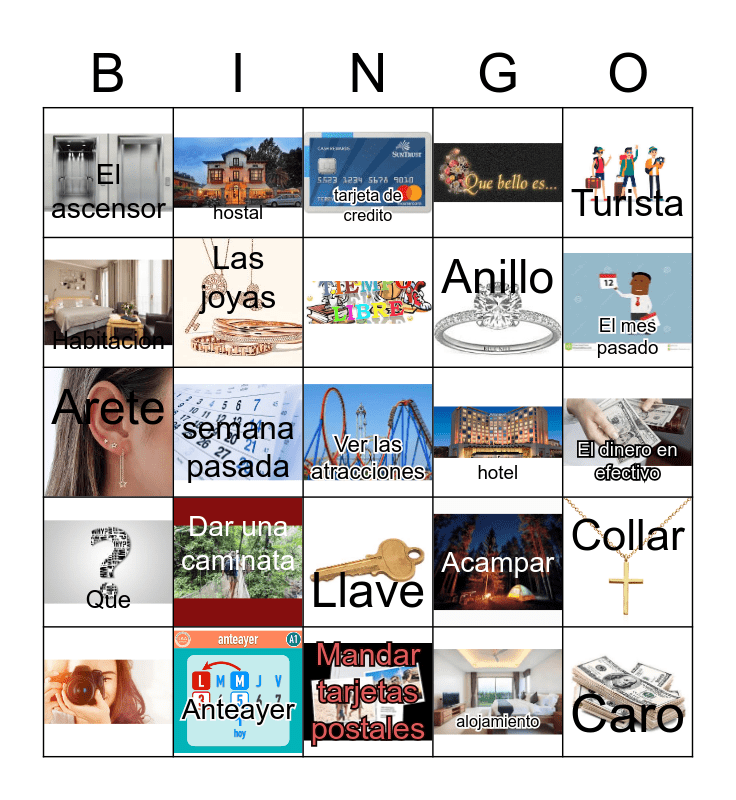 This bingo card has 25 images and 22 words: Dar una caminata, Mandar tarjetas postales, Turista, El ascensor, Habitacion, hostal, hotel, Llave, Anillo, Arete, Acampar, Collar, Las joyas, Caro, El dinero en efectivo, tarjeta de credito, El mes pasado, semana pasada, Ver las atracciones, Anteayer, Que and alojamiento.