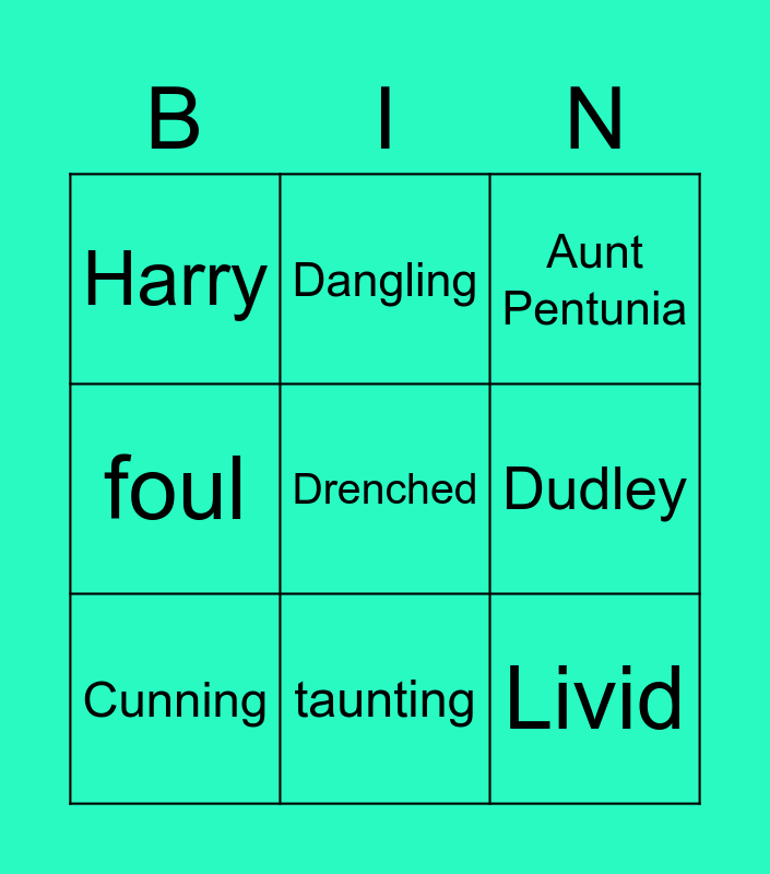 This bingo card has a free space and 14 words: Abnormality, Belch, Cunning, Dangling, foul, Livid, Lounge, Simpering, taunting, Harry, Mr. Dursley, Dudley, Aunt Pentunia and Hedwig.