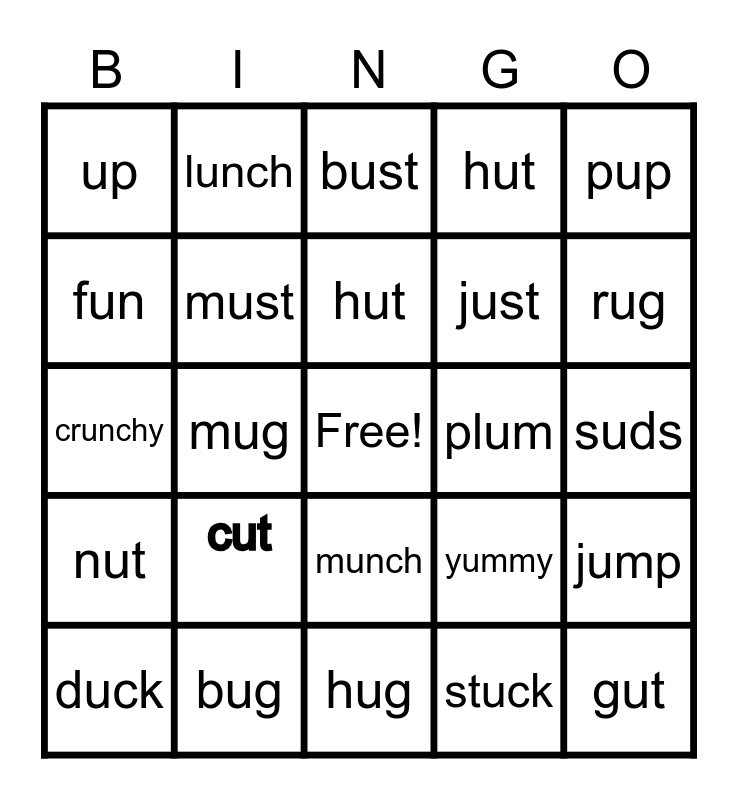 This bingo card has a free space and 24 words: cut, bug, hut, duck, pup, up, fun, lunch, plum, munch, just, crunchy, yummy, jump, must, stuck, suds, bust, rug, mug, gut, nut, hut and hug.